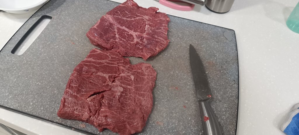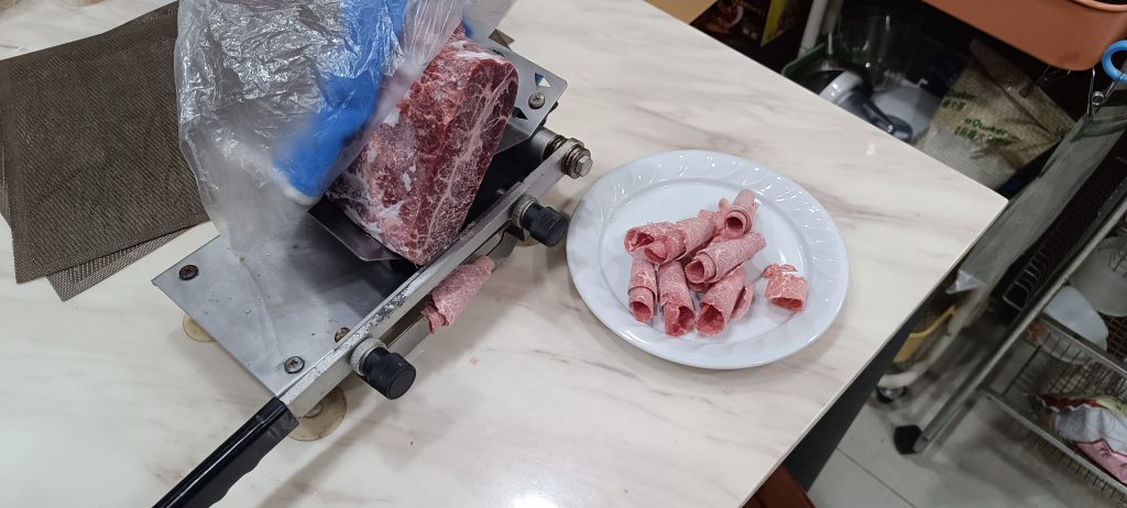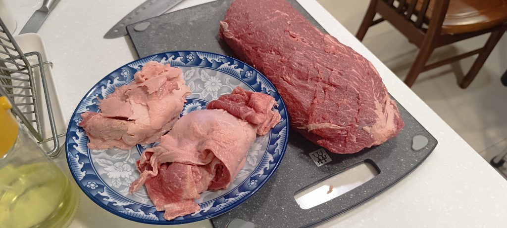 2. 中段:火鍋肉片 中段我會整理好,放進冷凍庫,要使用時在用切肉片的工具切成火鍋肉片,低脂的火鍋肉片,比牛五花還健康。