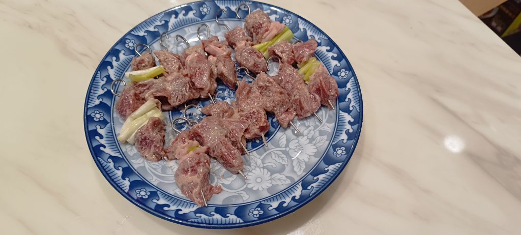 3. 後段:孜然牛肉烤串 後段中間夾著比較多的筋,我會把肉取下,然後串起來放到氣炸鍋做牛肉烤串。