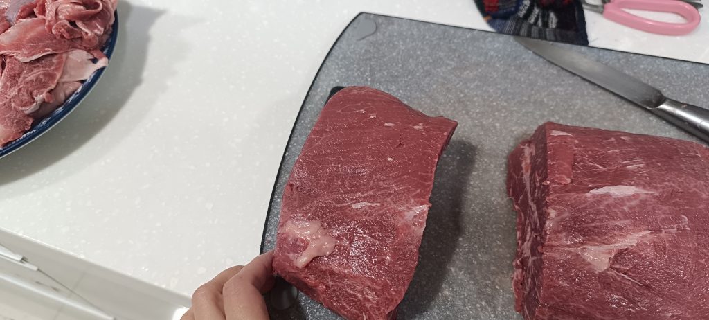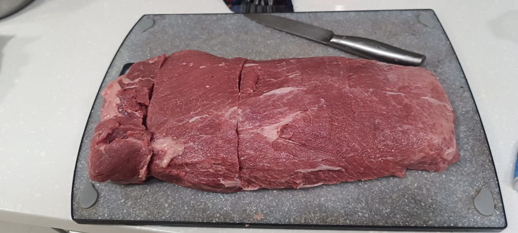 修掉表面的筋膜後,您會得到一條紅潤漂亮的牛肉條。接下來要依照您的飲食習慣來分切。以我這次的計畫為例,我採用「1刀4吃」的策略: