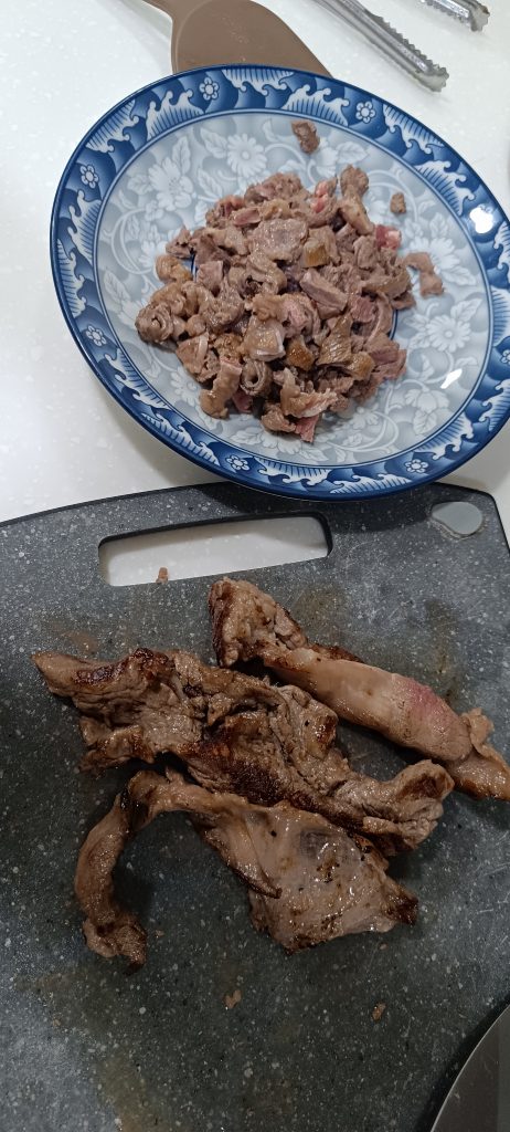 所以,我們的策略很簡單:把軟嫩的肉切出來煎或炒,把咬不動的筋膜修下來燉或滷。