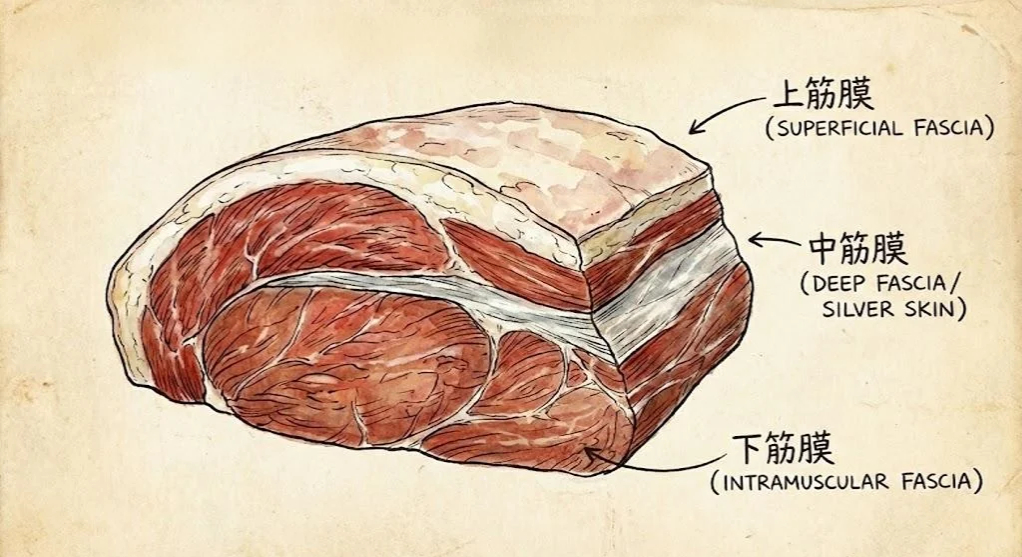 這塊肉的特色是「三明治結構」,上層、下層、中間各有一層筋膜。中間那條板筋比較深,我們晚點處理,先解決表面的。